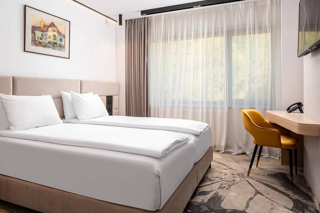 Hotelul dispune de un numar de 168 de camere si apartamente renovate, confortabile, cu design modern, cu sau fara balcon si vedere spre munte sau spre oras. Spatiile de cazare pot acomoda maxim doua sau trei persoane (apartamente). Paturile confortabile si facilitatile moderne ale camerei ofera relaxarea necesara unui sejur de neuitat.