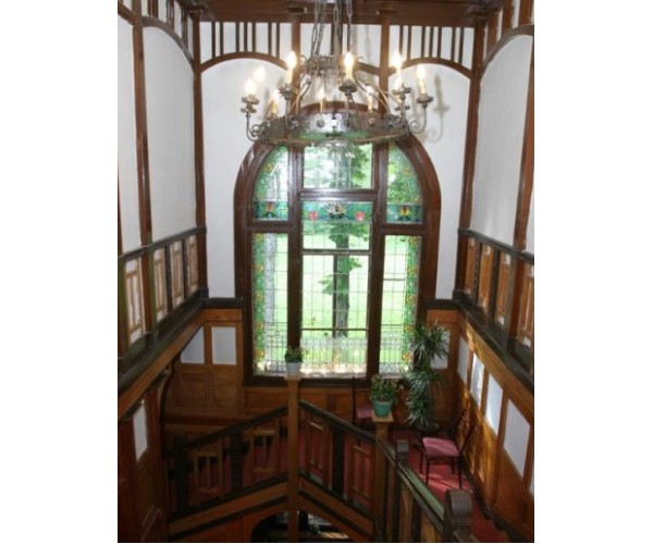 Printr-o spectaculoasa alternanta a lemnului cu vitraliile originale, in care camelia intruneste toate prerogativele unui laitmotiv imagistic, cu oglinzile de calitate si peretii zugraviti sau tapetati, ce imbratiseaza minunata scara interioara, se creeaza un inefabil joc pictural, accentuat de tusele negre. Deasupra, cercul larg al lampadarului din fier forjat, realizat intr-o pura maniera medievala, completeaza armonios, fara ostentatie, cu fireasca eleganta, un interior de vis.