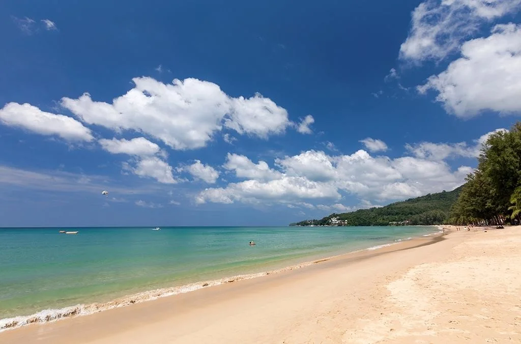Plaja larga cu nisip din Kamala, cu o intrare treptata in mare, nisip alb si apa limpede