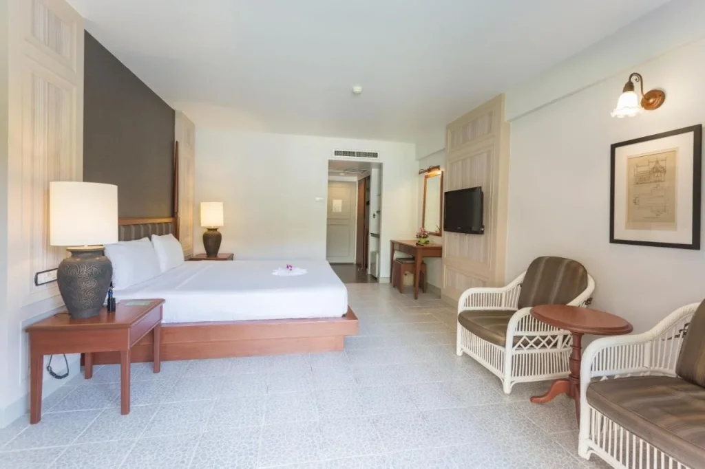 Camera Deluxe – Spa?ioas? ?i decorat? într-un stil asiatic modern bine definit, aceast? camer? dispune de un pat dublu confortabil ?i un balcon privat cu vedere spre gr?dina tropical? umbrit?, plin? de ornamente. Dot?rile includ aer condi?ionat, minibar, aparat de cafea/ceai, TV prin satelit cu canale prin cablu, telefon, seif ?i birou de lucru. Baia privat? este echipat? cu du?, halate de baie, papuci ?i produse de toalet?, plus usc?tor de p?r. WiFi gratuit este disponibil pentru rezerv?rile directe, draperii opace asigur? un somn odihnitor, iar menajul zilnic completeaz? confortul sejurului. Room service este disponibil între orele 11:00 ?i 22:00. Camera este destinat? nefum?torilor.
