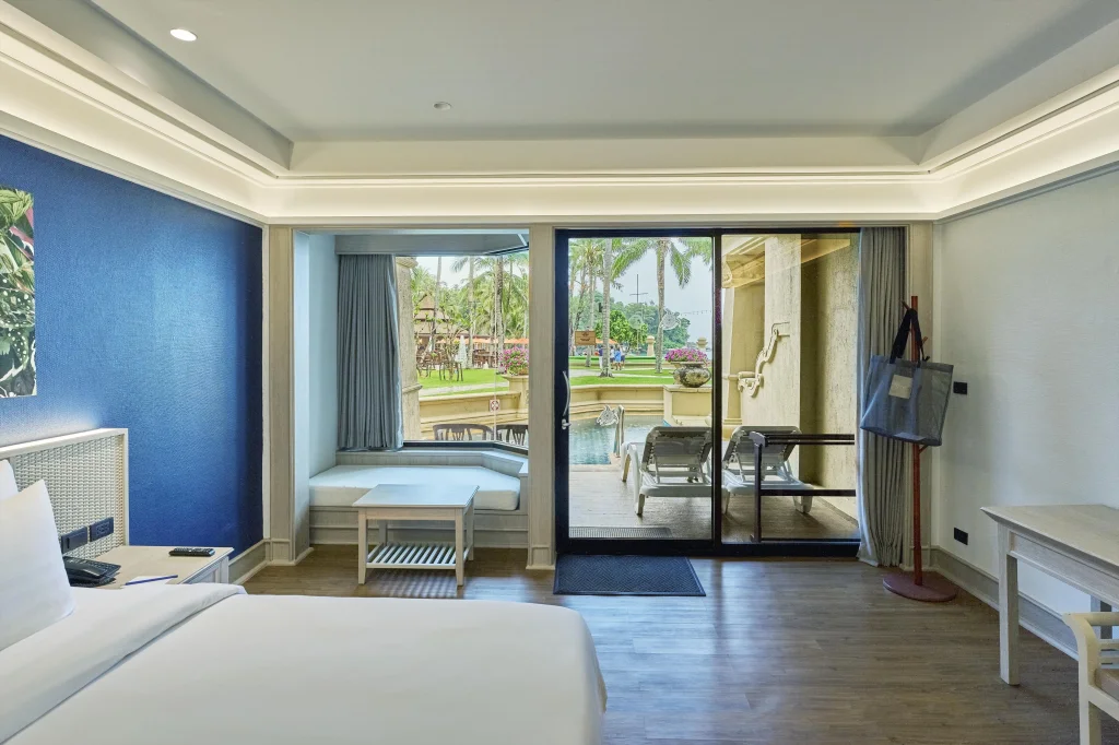 Deluxe Pool Room — 40 m², cea mai spa?ioas? dintre camerele Deluxe, cu balcon propriu ?i acces sau vedere la piscin?, plus halate ?i papuci. Ideal? pentru cei care vor s? se bucure de atmosfera resortului f?r? s? ias? din camer?.