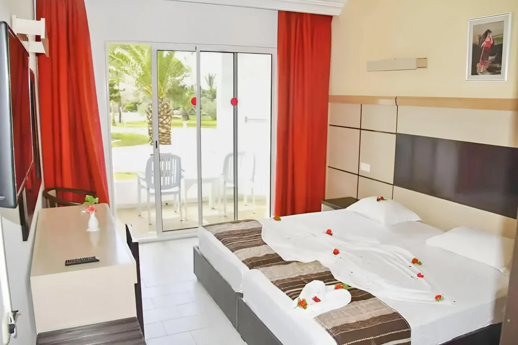 Camera dubl? cu vedere la gr?din? – dotat? cu aer condi?ionat controlat individual (disponibil în sezonul principal), telefon, TV satelit, minibar ?i balcon sau teras?. Baia dispune de du?, toalet? ?i usc?tor de p?r. Seiful se afl? la recep?ie, disponibil contra cost pe baz? de cheie ?i depozit.