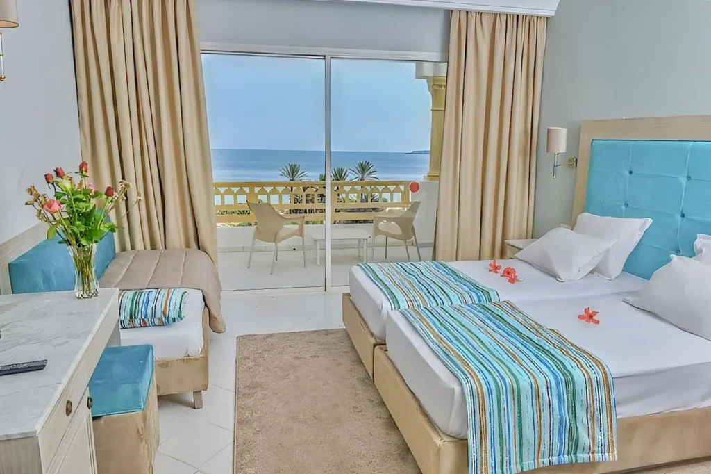 Camera Dubl? – Camerele sunt dotate cu baie privat? cu toalet? ?i usc?tor de p?r, aer condi?ionat centralizat (disponibil în sezonul de vârf), televizor cu canale satelit, telefon, seif personal ?i balcon sau teras? privat? de unde po?i savura aerul mediteranean. Dot?rile practice ?i finisajele îngrijite asigur? un sejur confortabil în aceast? destina?ie tunisian? însorit?.