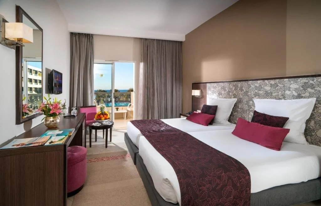 Camera Dubl? cu Vedere la Mare – Toate dot?rile camerei standard, cu avantajul suplimentar al unei priveli?ti superbe spre mare. Balconul sau terasa devin astfel locul ideal pentru a savura r?s?ritul sau apusul deasupra apelor mediteraneene, ad?ugând un plus de romantism ?i relaxare vacan?ei dumneavoastr? în Tunisia.