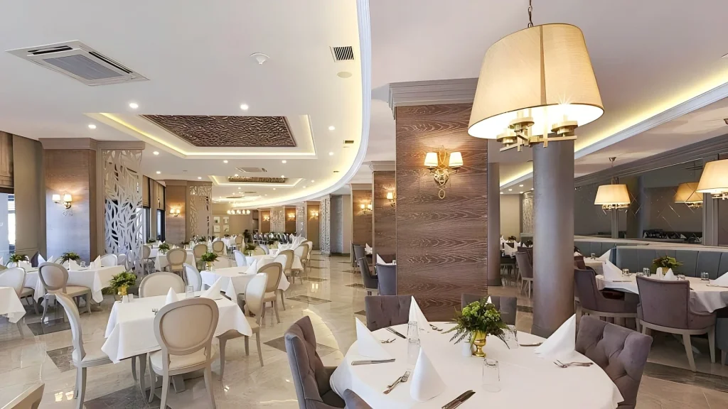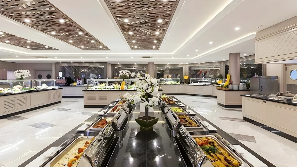 Pachetul Ultra All Inclusive al hotelului este unul dintre cele mai generoase din zon?. Mesele principale se servesc în restaurantul principal tip bufet: mic dejun între 7:00–11:00, inclusiv suc proasp?t de portocale, prânz între 12:30–14:30 ?i cin? între 19:00–21:30. Patiseria este deschis? între 10:00 ?i 19:00 cu deserturi ?i pr?jituri, iar meniul de gust?ri de la restaurantul Begonvil este disponibil între 12:30 ?i 17:30. B?uturile r?coritoare de noapte sunt servite în restaurantul principal între 23:30 ?i 01:00. Pachetul include b?uturi nealcoolice, alcoolice locale ?i alcool selectat din import – bauturile interna?ionale sunt, a?adar, incluse. Incluse în sejur se num?r? ?i dou? cine la restaurantele a la carte – unul cu specific turcesc ?i unul de pe?te – cu rezervare prealabil? obligatorie. Barurile func?ioneaz? dup? programe bine stabilite: Palm Bar 24 de ore din 24, Panorama Bar între 17:00–00:00, barul de la piscin? între 10:00–00:00 ?i Sea Bar între 19:00–00:00. Discoteca animeaz? serile între 23:00 ?i 02:00.