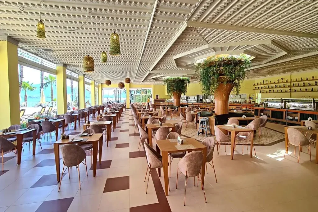Hotelul func?ioneaz? în regim All Inclusive Plus, unul dintre cele mai generoase pachete disponibile. Mesele principale se servesc dup? cum urmeaz?: mic dejun tip bufet între 07:00–10:00, mic dejun târziu între 10:00–11:00, prânz bufet între 12:30–15:00 ?i cin? bufet între 19:30–21:30. Pe parcursul zilei sunt disponibile ?i numeroase gust?ri: gustare la amiaz? (11:00–12:30), înghe?at? (11:00–18:00), gözleme – cl?tite turce?ti tradi?ionale (11:00–16:00), patiserie (16:00–18:00) ?i cin? devreme (16:30–21:30). B?uturile r?coritoare de dup?-amiaz? sunt disponibile între 15:00–18:00, iar b?uturile de sear? între 19:00–00:00, cu serviciu continuu de b?uturi pe timp de noapte. B?uturile alcoolice ?i nealcoolice de produc?ie local? ?i importat? selectat? sunt incluse non-stop. Oaspe?ii pot opta, contra cost, pentru cina în cele 3 restaurante specializate (pe?te, italian, asiatic), disponibile între 19:30 ?i 21:30. Orele de servire pot fi modificate de hotel.